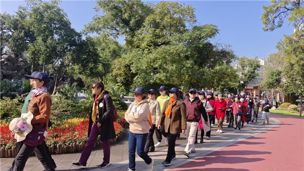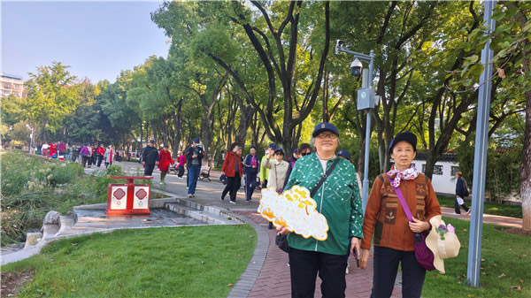 抵達公園后,健步活動正式開啟。1.5 公里的湖邊步道平坦無陡坡,老人們戴著統一的定制棒球帽,三五成群,伴著秋風與花香緩緩前行。社區還在古亭、桂花林、親水棧道設置了 3 處 “秋日打卡點”,準備了茱萸香囊、書法折扇等重陽節主題道具。“來,咱們拿著香囊合張影!”72 歲的王阿姨拉著鄰居李阿姨,在桂花樹下留下了開心的笑容,工作人員則在一旁講解著武昌地域文化與公園生態知識,讓健步行變成了 “邊走邊學” 的文化之旅。中途休息時,老人們紛紛拿出能量包里的牛奶和蛋糕,邊補充能量邊交流沿途見聞,氛圍格外融洽。