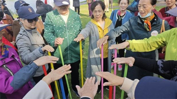 健步結束后,古戲臺前的空地上熱鬧起來 ——“不倒森林”“珠行萬里” 兩項輕量拓展游戲接連開展。在“不倒森林” 中,老人們圍圈手持塑料桿,相互配合保持桿子不倒;“珠行萬里”游戲里,大家 5-6 人一組,用U型槽接力傳送小球,現場不時響起陣陣笑聲。社區還為獲勝小組額外準備了重陽糕,不少平時僅在社區偶遇的老人,通過游戲組隊熟悉起來,分享著各自的生活趣事,社交壁壘在歡樂中悄然打破。