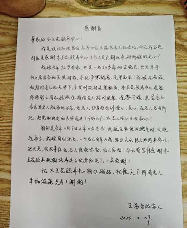 “要不是彭社工及時幫忙,我娘這事兒真不敢想!”11月9日,武漢市武昌區水果湖街道東亭社區王滿香老人的家屬將一封手寫感謝信送到木蘭花頤養中心,字里行間滿是對助老服務的感激——這是該中心依托“武昌區水果湖街道居家養老服務項目”織密社區為老服務守護網的又一暖心縮影。
