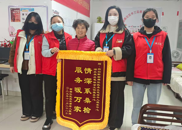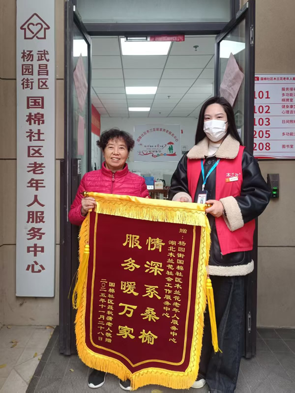 11月28日,社區(qū)居民聶秋蒲婆婆懷著感激之情,將一面寫有“情深系桑榆 服務(wù)暖萬(wàn)家”的錦旗送到了國(guó)棉社區(qū)老年人服務(wù)中心,以此感謝中心工作人員們長(zhǎng)期以來(lái)對(duì)她的悉心照料與暖心服務(wù)。